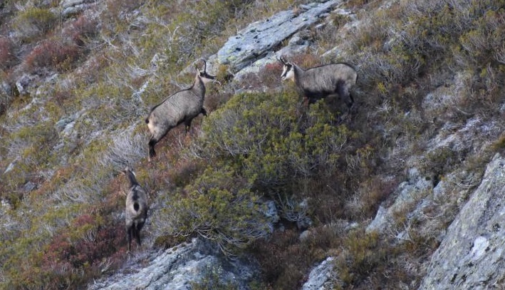 Informations :Membre de la sous-famille des caprinés (caprins) avec les bouquetins et les mouflons, ils sont les plus petits. Un mâle pèse entre 22 et 40 kg avec un poids maximal en automne dû aux réserves pour l'hiver. Ils ont une espérance de vie moyenne de 15 à 16 ans. Leur sénescence commence vers l'âge de 10 ans. Ils disposent d'un duvet pour la protection du froid en hiver et le pelage se noircit. Les chamois disposent d'un très bon odorat qui leur permet de détecter un intru à plus de 500 m en cas de vent favorable. Le pied du chamois est constitué de façon à ne pas trop s'enfoncer dans la neige. Leur physiologie est adapté à l'altitude avec un gros cœur, de gros poumons et un sang riche en globules rouges et peut donc gravir 600 m en altitude en quelques minutes aisément. Ils évitent les pentes exposées au soleil. Il se cantonne en altitude principalement dû aux activités humaines plus basses, mais s'accommode très bien autour des 600 m si le relief est accidenté. Ils ont une grande résistance au froid et fréquentent surtout les ubacs et les zones ombragées afin de limiter la perte en eau. Ils vivent en hardes. |